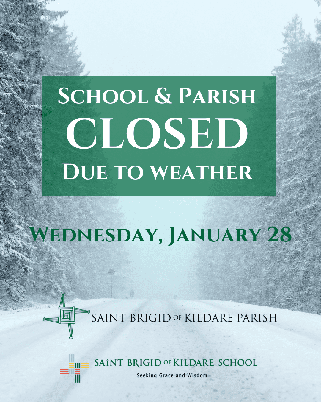 St. Brigid School, Preschool, Wolfhound Clubhouse, and the Parish Office will be closed Wednesday, January 28th due to the weather and road conditions. Â